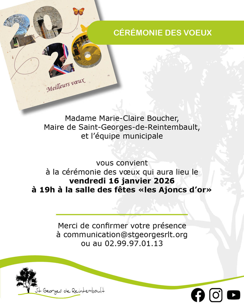 Celle-ci aura lieu le vendredi 16 janvier 2026 à 19h à la salle des fêtes «les Ajoncs d’or», (les sapins, Saint-Georges-de-Reintembault).