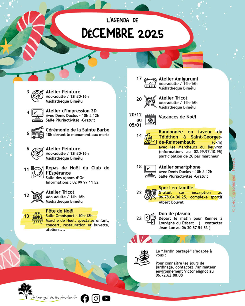 Vous trouverez ci-contre l’agenda des sorties et animations du mois de DÉCEMBRE 2025 sur la commune.
