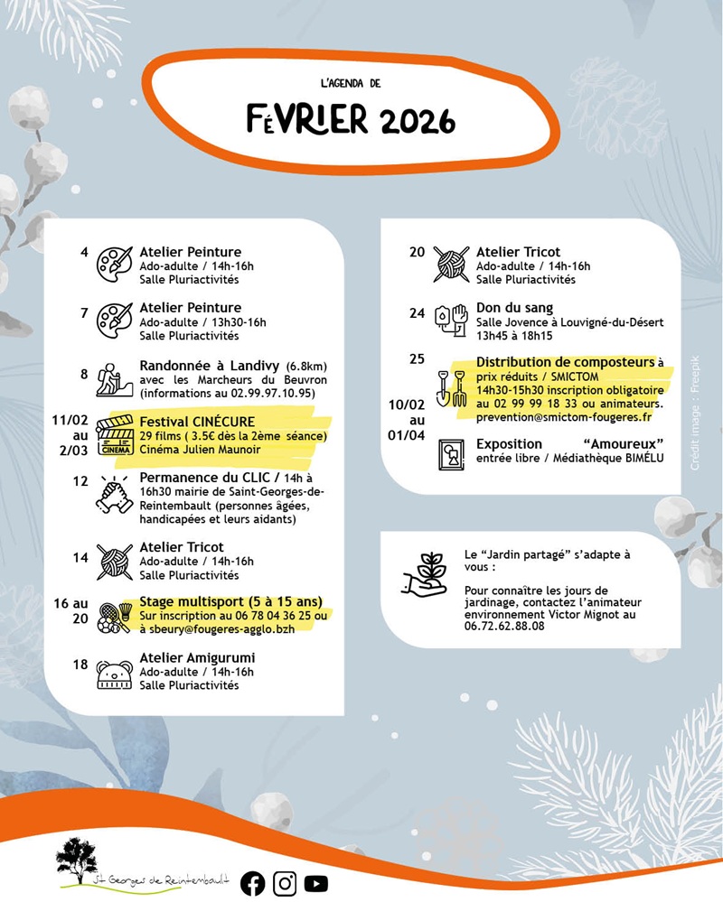 Vous trouverez ci-contre l’agenda des sorties et animations du mois de FÉVRIER 2026 sur la commune de Saint-Georges-de-Reintembault.
