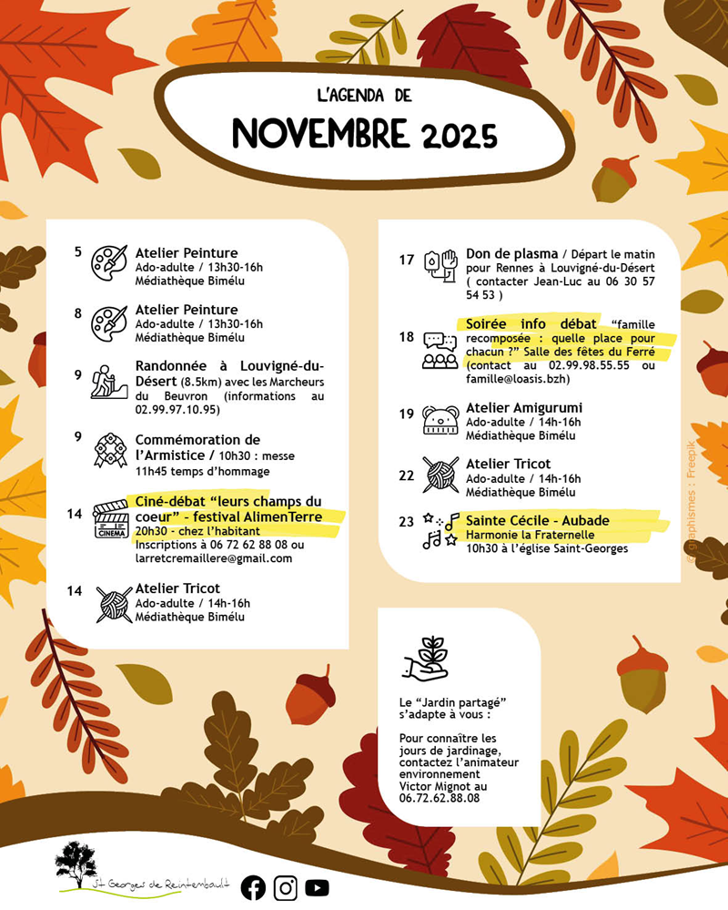 Vous trouverez ci-contre l’agenda des sorties et animations du mois de NOVEMBRE 2025 sur la commune.